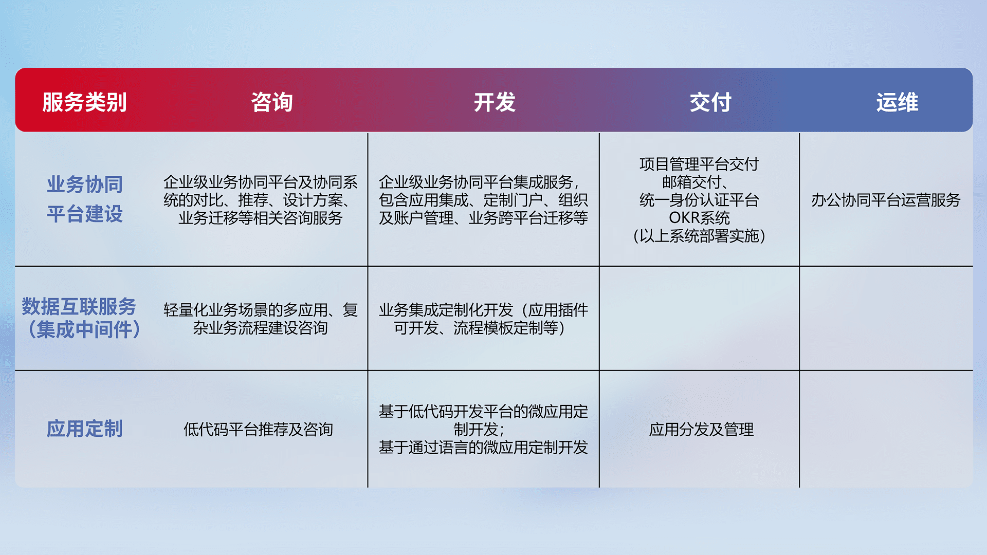 针对钉钉、、、、企微、、、IDaas等平台级产品提供产品的规划、、、、方案、、、交付、、定制化开发等服务,,实现如统一协同办公、、、、智能客户服务、、、、混合会议管理、、、、智能数据查询、、、等业务场景,,,,实现数字化转型。。。
